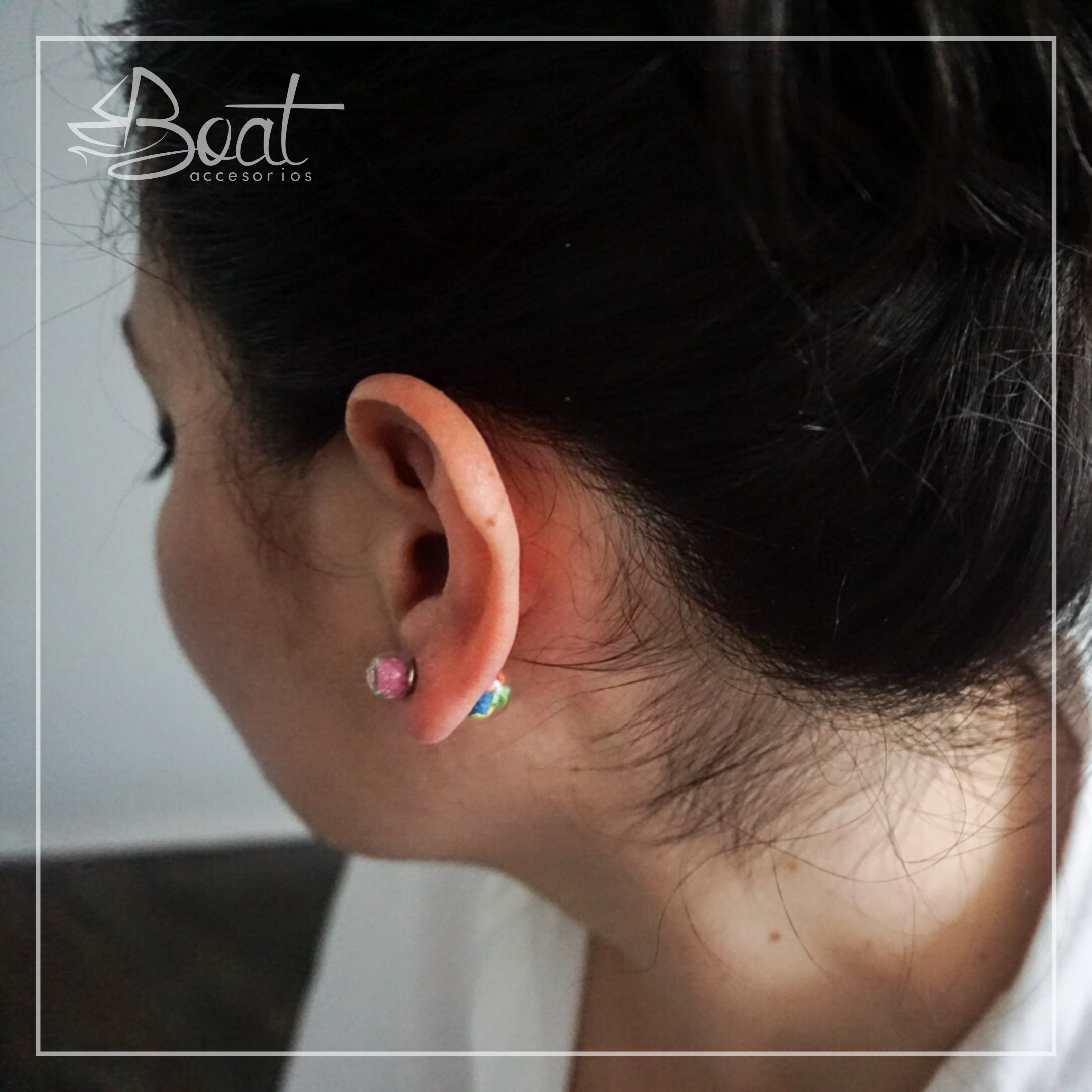 Aretes topo de doble globo con estrellas de papel y caviar.